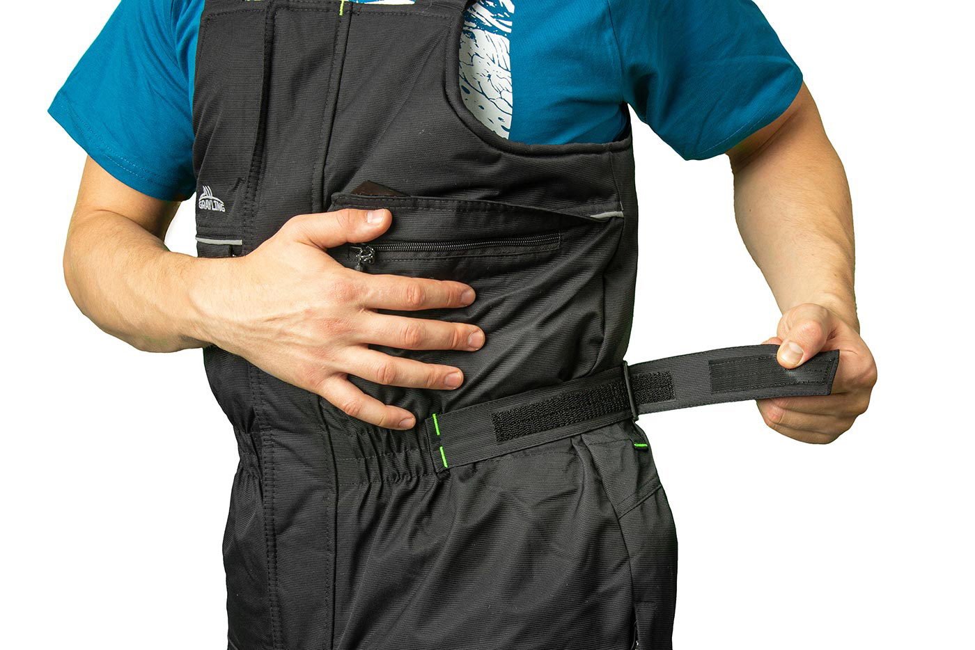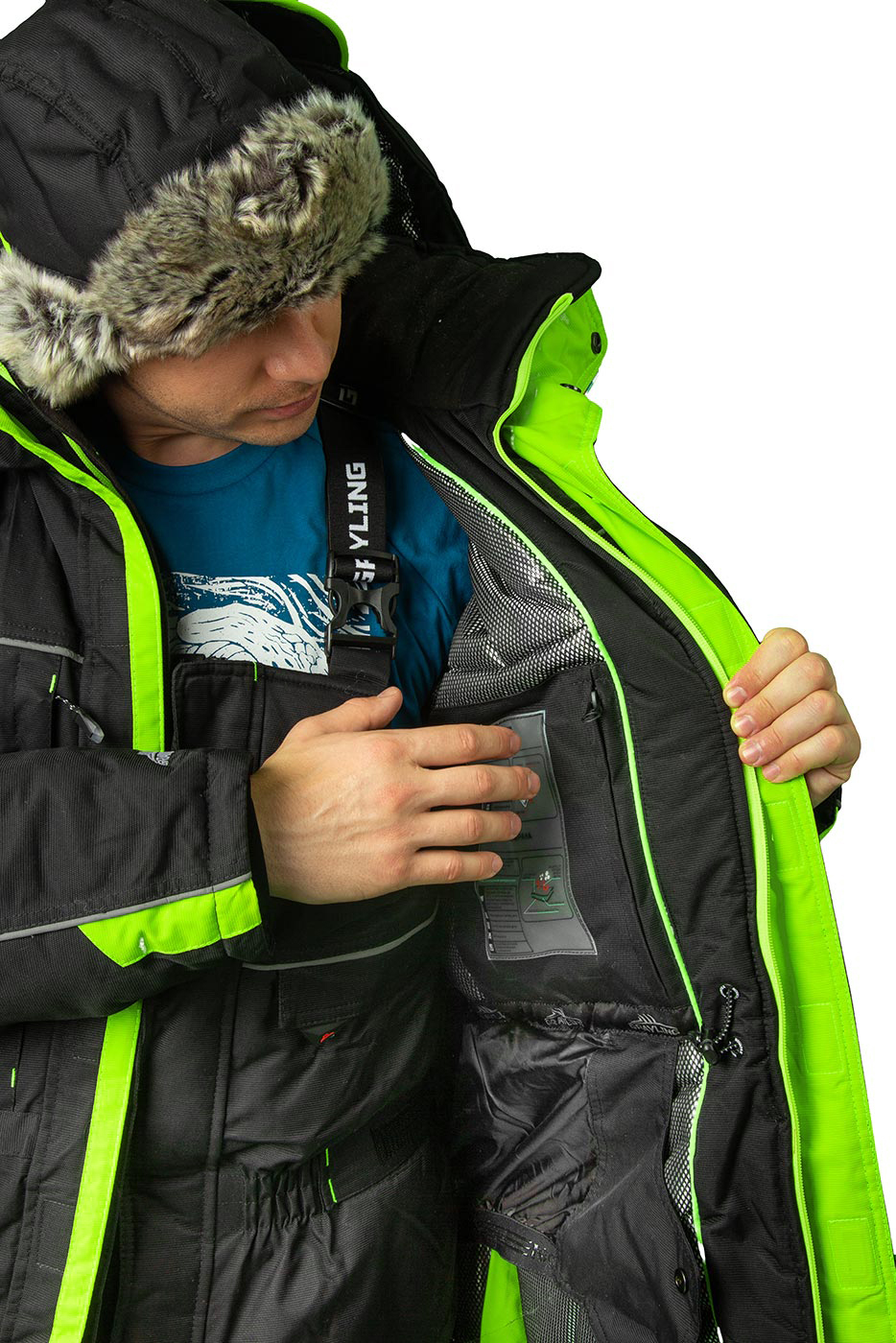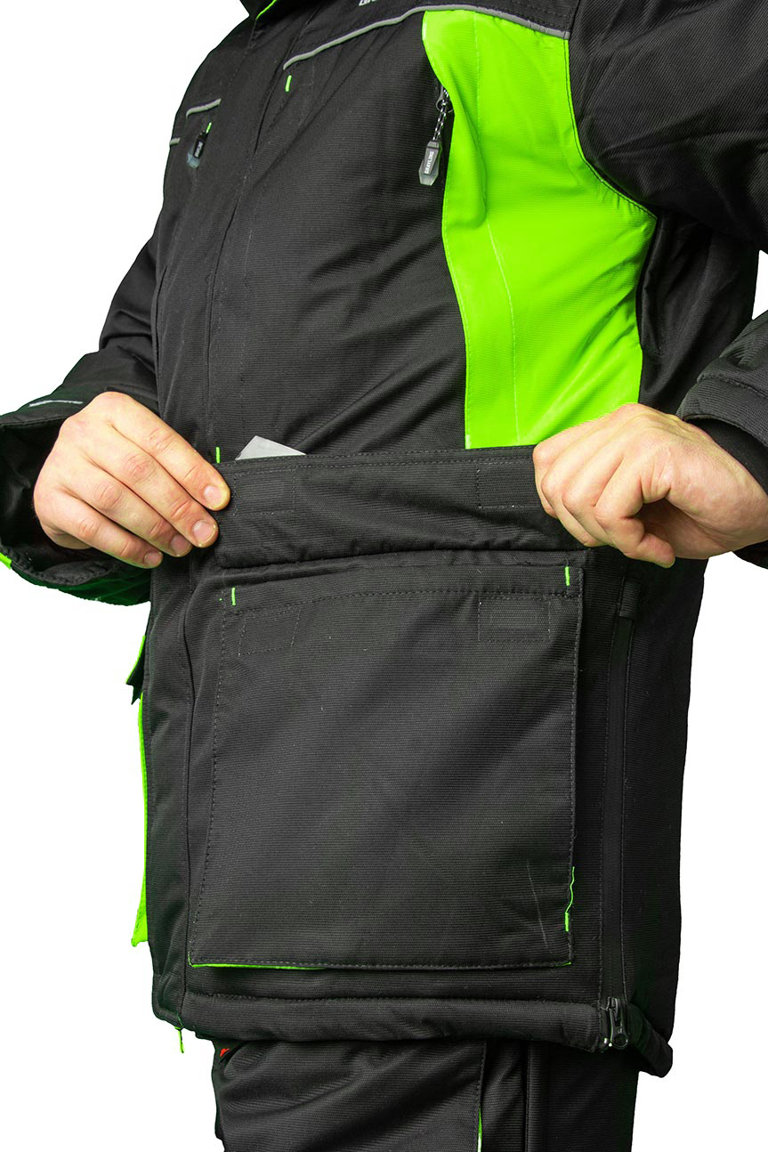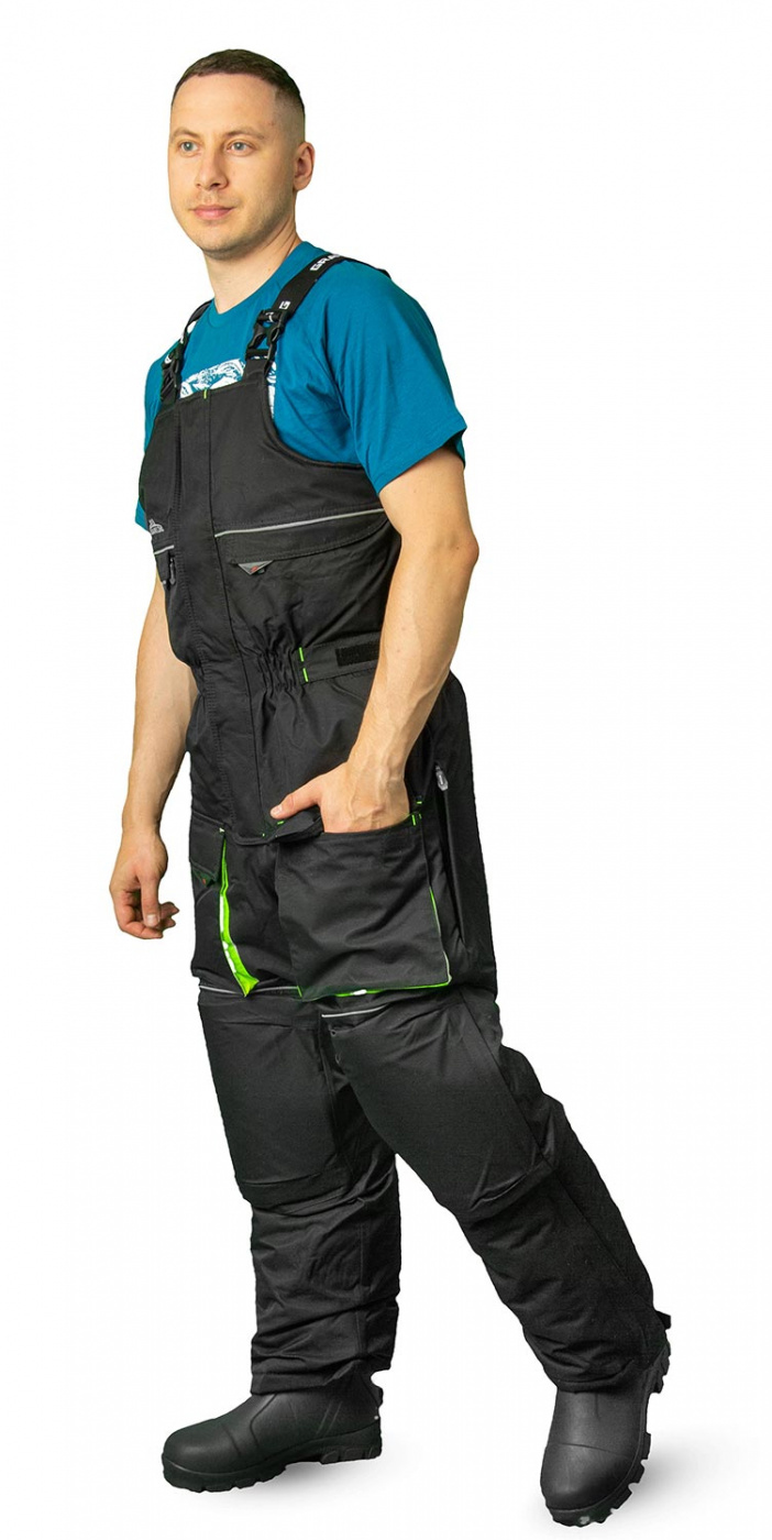 Зимний рыболовный костюм «Селигер» из особой прочной мембранной ткани «кошачий глаз». Удлиненная куртка закрывается на молнию с двумя бегунками. По бокам увеличивается в объеме за счет вставок на молнии. Неопреновые манжеты препятствуют потере тепла и защищают от брызг. Высокие брюки-полукомбинезон собираются на талии на резинку, регулируются по ширине патами на липучках. На поясе расположены шлевки под ремень.