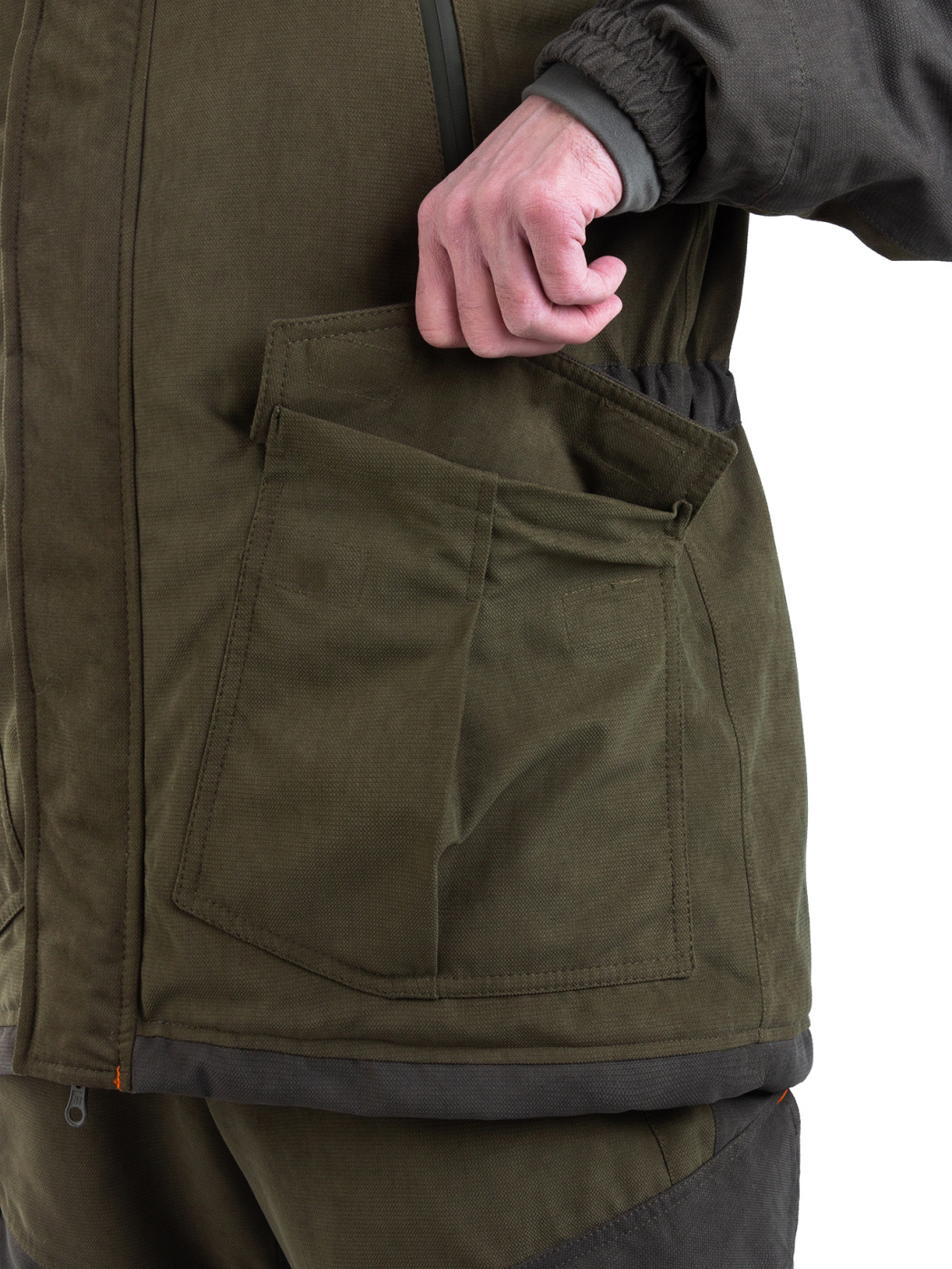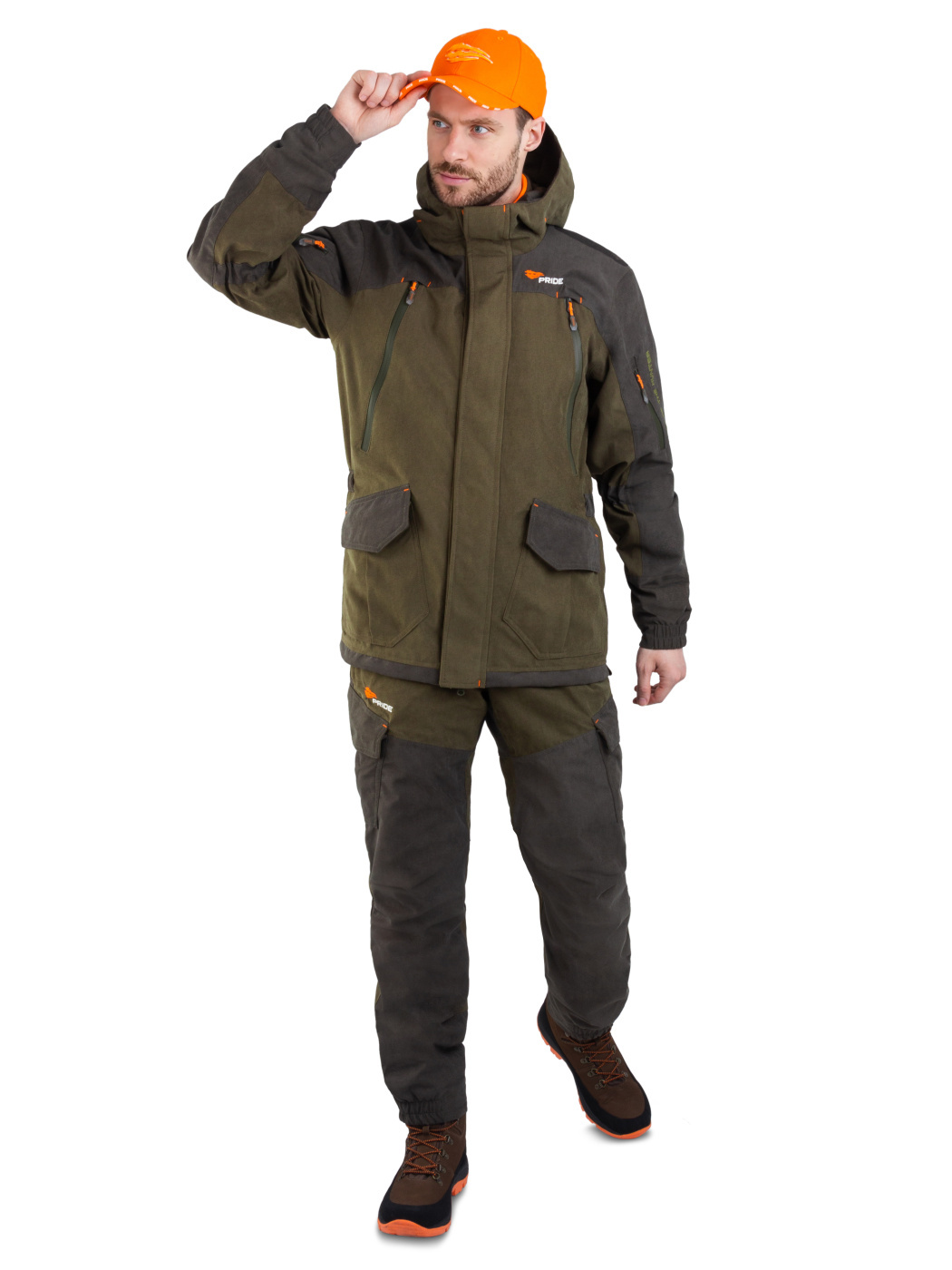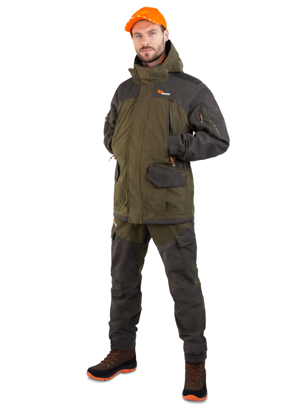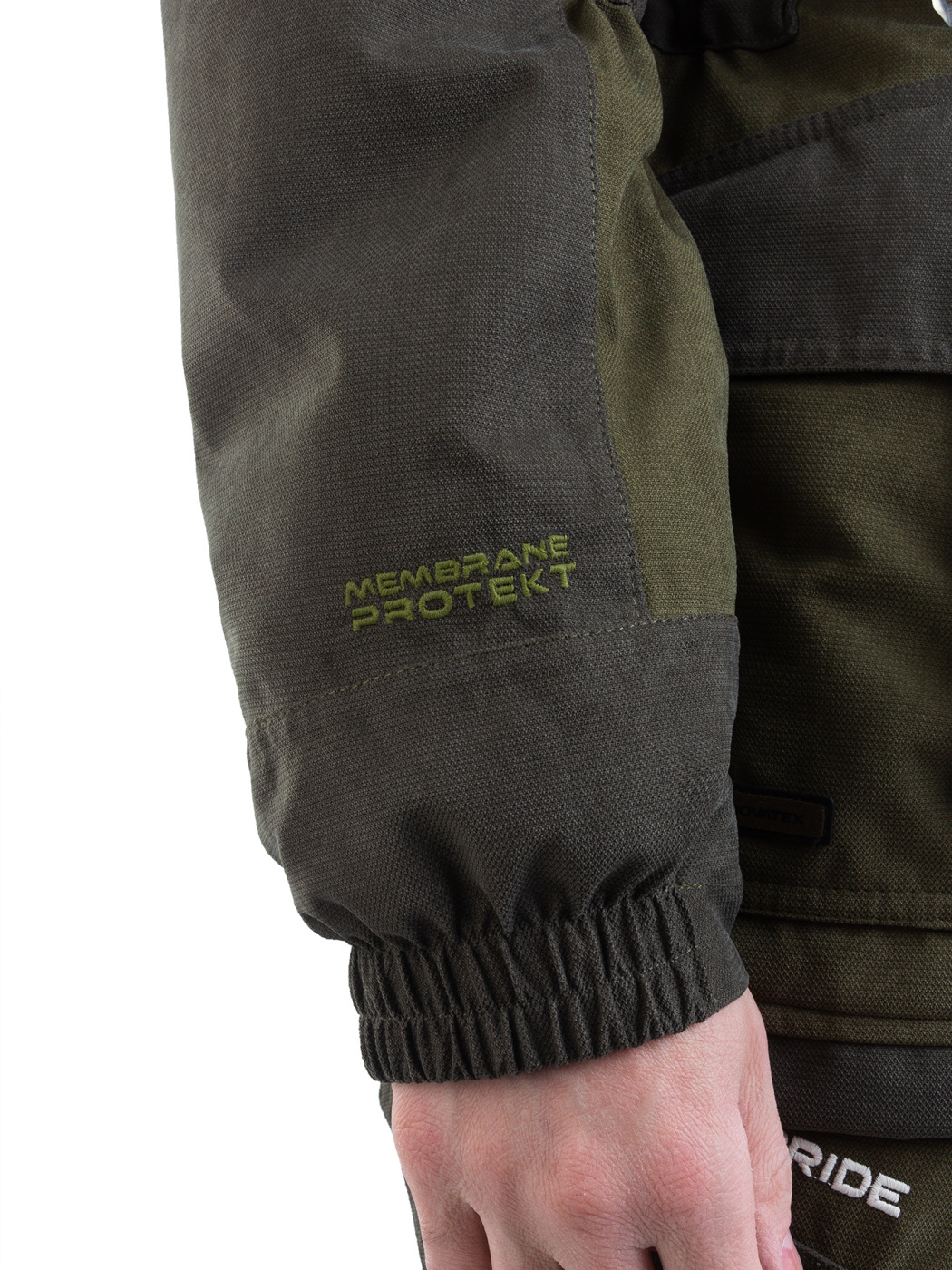 Комплект Куртка с полукомбинезоном. Куртка: центральная потайная застежка на пуговицах, воротник отложной, два нагрудных кармана с клапанами на липучках и два нижних объемных боковых, внутренний накладной карман, манжеты застегиваются на пуговицы, по кокетке, спинке и рукавам. Полукомбинезон: с центральной и боковыми застежками на пуговицы, карманы спереди и сзади, большой нагрудный карман на молнии и боковой карман под инструменты, ширина по линии талии и длина бретелей регулируется эластичной тесьмой на передних и задних половинках брюк СОП 5 см.