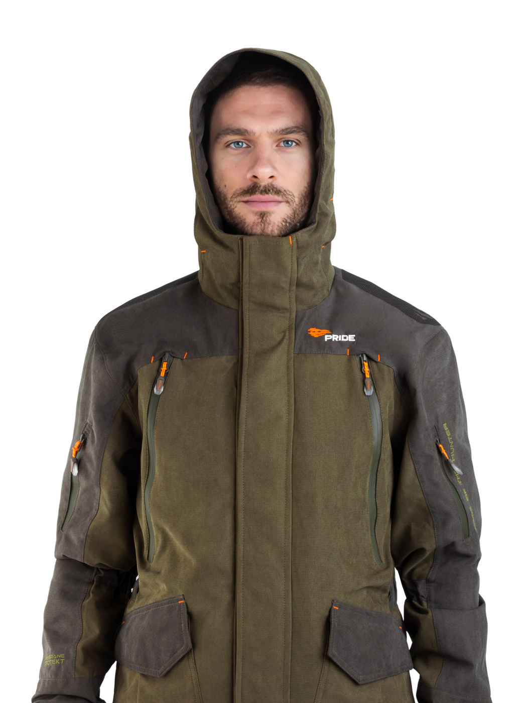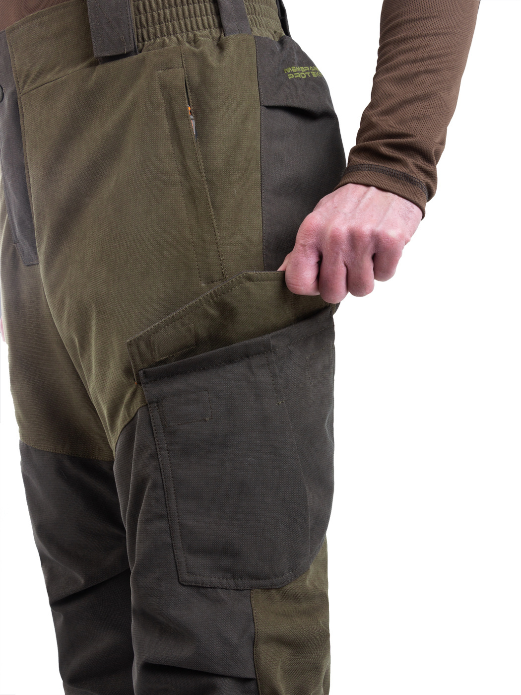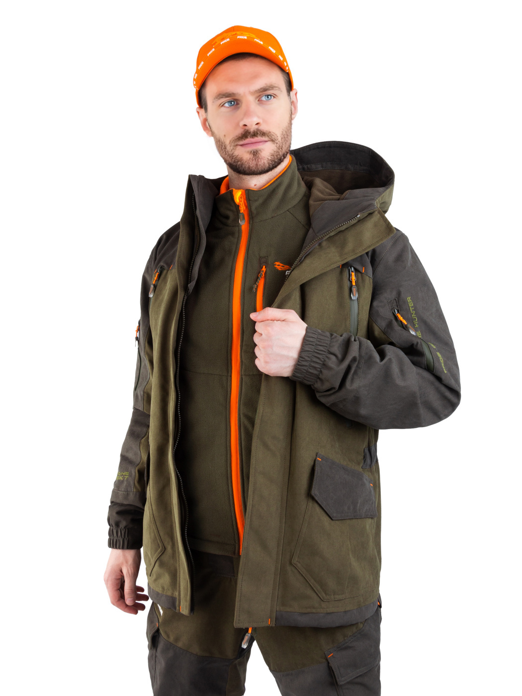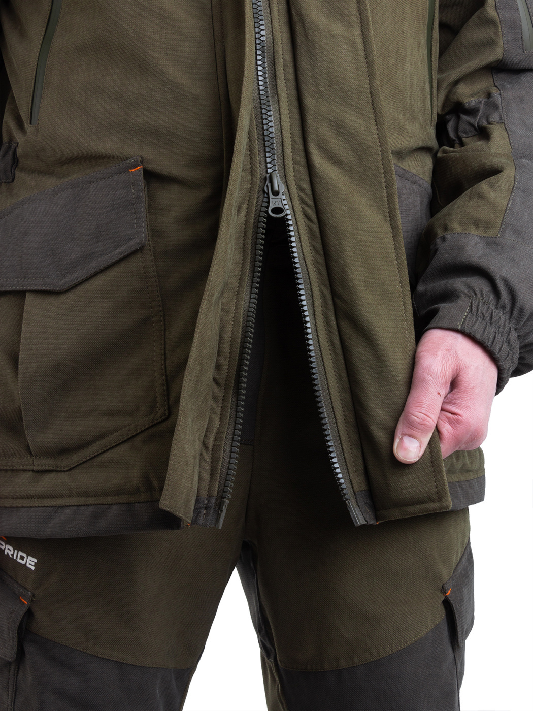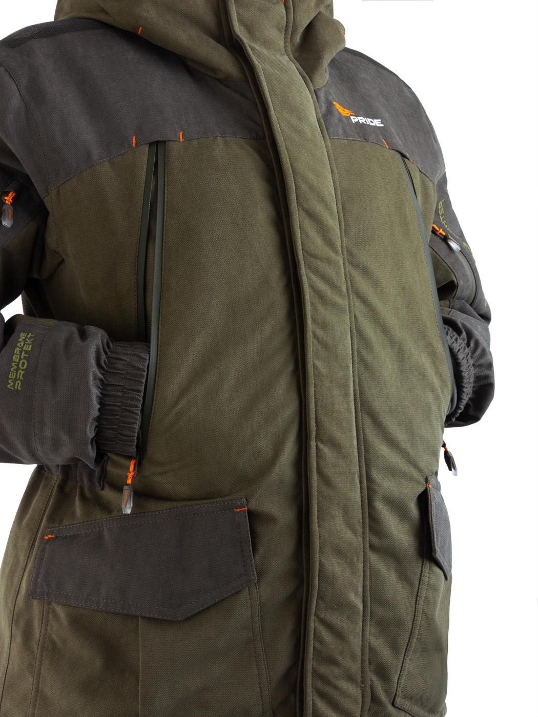 Комплект Куртка с полукомбинезоном. Куртка: центральная потайная застежка на пуговицах, воротник отложной, два нагрудных кармана с клапанами на липучках и два нижних объемных боковых, внутренний накладной карман, манжеты застегиваются на пуговицы, по кокетке, спинке и рукавам. Полукомбинезон: с центральной и боковыми застежками на пуговицы, карманы спереди и сзади, большой нагрудный карман на молнии и боковой карман под инструменты, ширина по линии талии и длина бретелей регулируется эластичной тесьмой на передних и задних половинках брюк СОП 5 см.